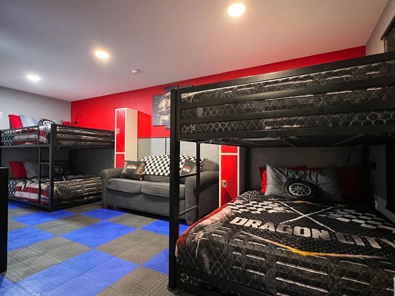 These fun, racing-themed rooms features two sets of black metal bunk beds with checkered and tire-patterned bedding, a cozy gray sofa sleeper with checkered pillows, and vibrant red and gray decor. A mini kitchen with retro fridge and microwave, modern lighting and rubberized flooring make it perfect for active families or groups. Personal lockers add convenience, making this stylish, kid-friendly space ideal for a memorable stay.
