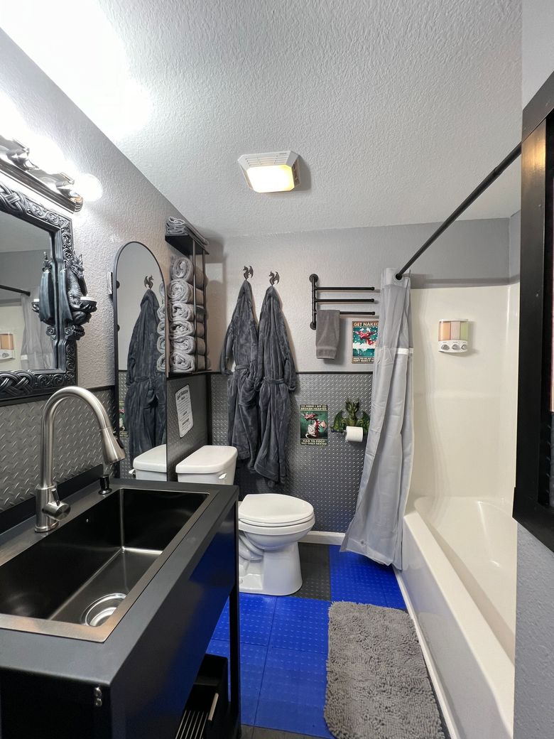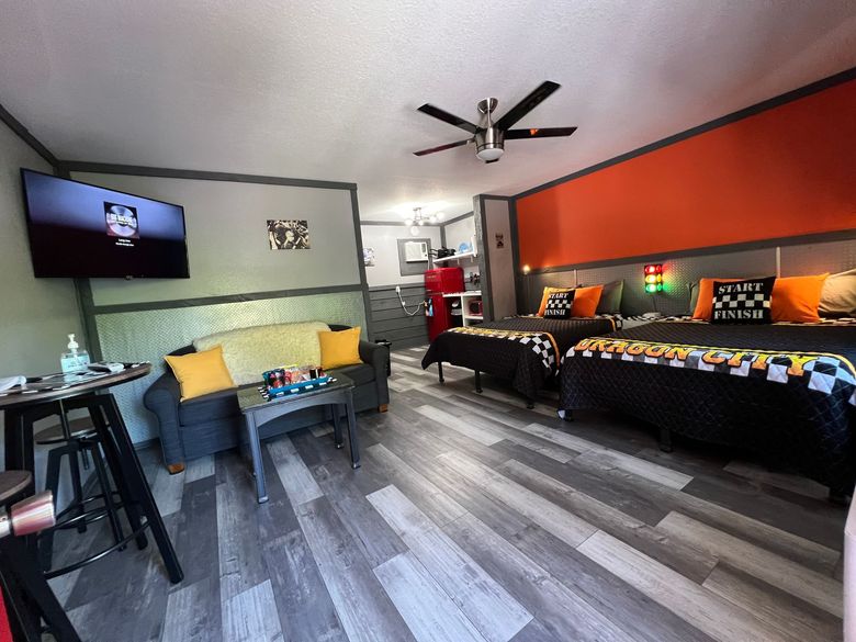 With two full beds and a sofa sleeper, these modern, racing-themed rooms are perfect for motor enthusiasts, featuring twin beds with "START" and "FINISH" pillows, traffic signal lights, and bold red and green accents. Enjoy a mini kitchen with a retro fridge and microwave, a deluxe bathroom with industrial touches, plush robes, luxury linens, and high-speed fiber internet.