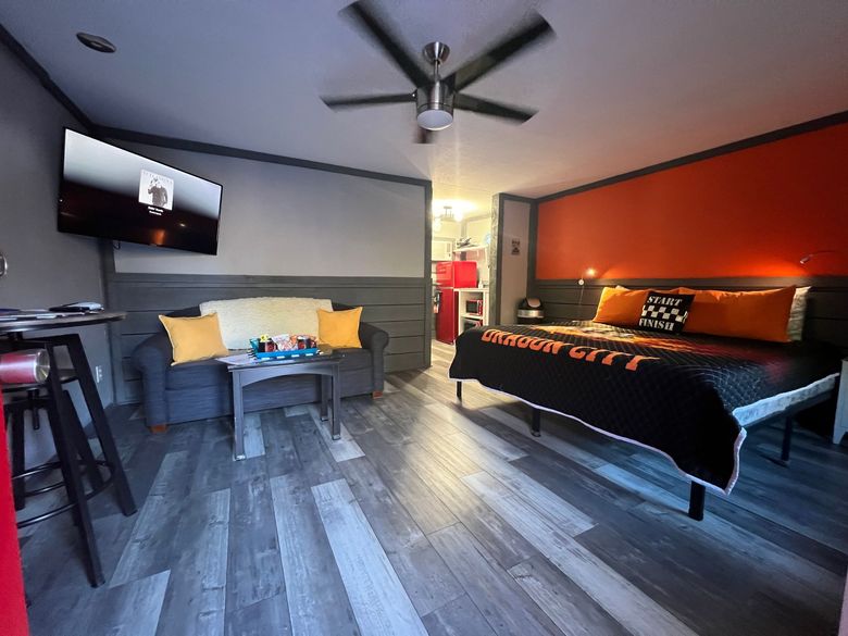 Stay in style and comfort with plenty of room for you and your gear. These racing-themed rooms feature a comfy king bed, and a sofa sleeper. Enjoy a mini kitchen with a retro fridge and microwave, a deluxe bathroom with industrial touches, plush robes, luxury linens, and high-speed fiber internet.